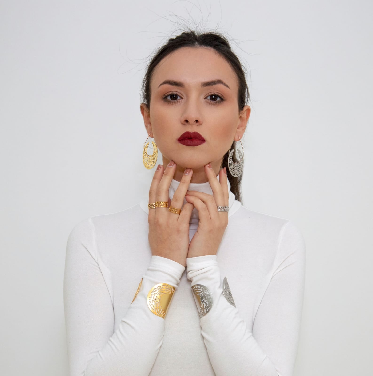 Arabi Cuff Bracelet is part of my Arabi Collection - this collection takes the Arabic Calligraphy to a brand new level of modern sophisticated design, I combined the Arabic letters with a clean minimal shapes of drops and circles to create this elegant wide cuff.