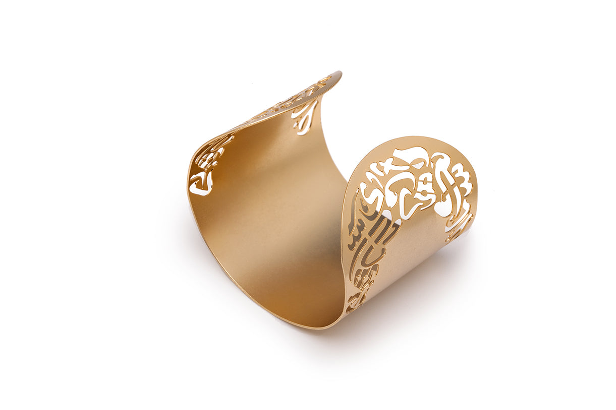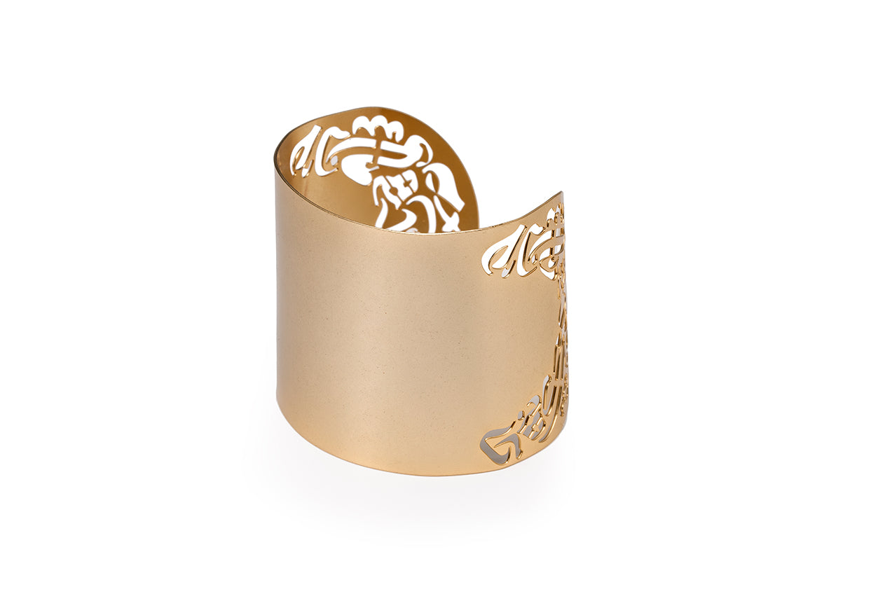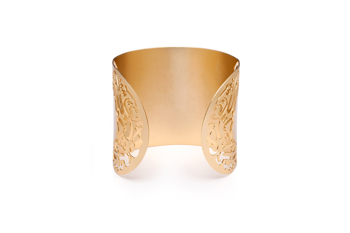 This cuff is made of brass with Arabic calligraphy letter cuts plated with gold or rhodium.