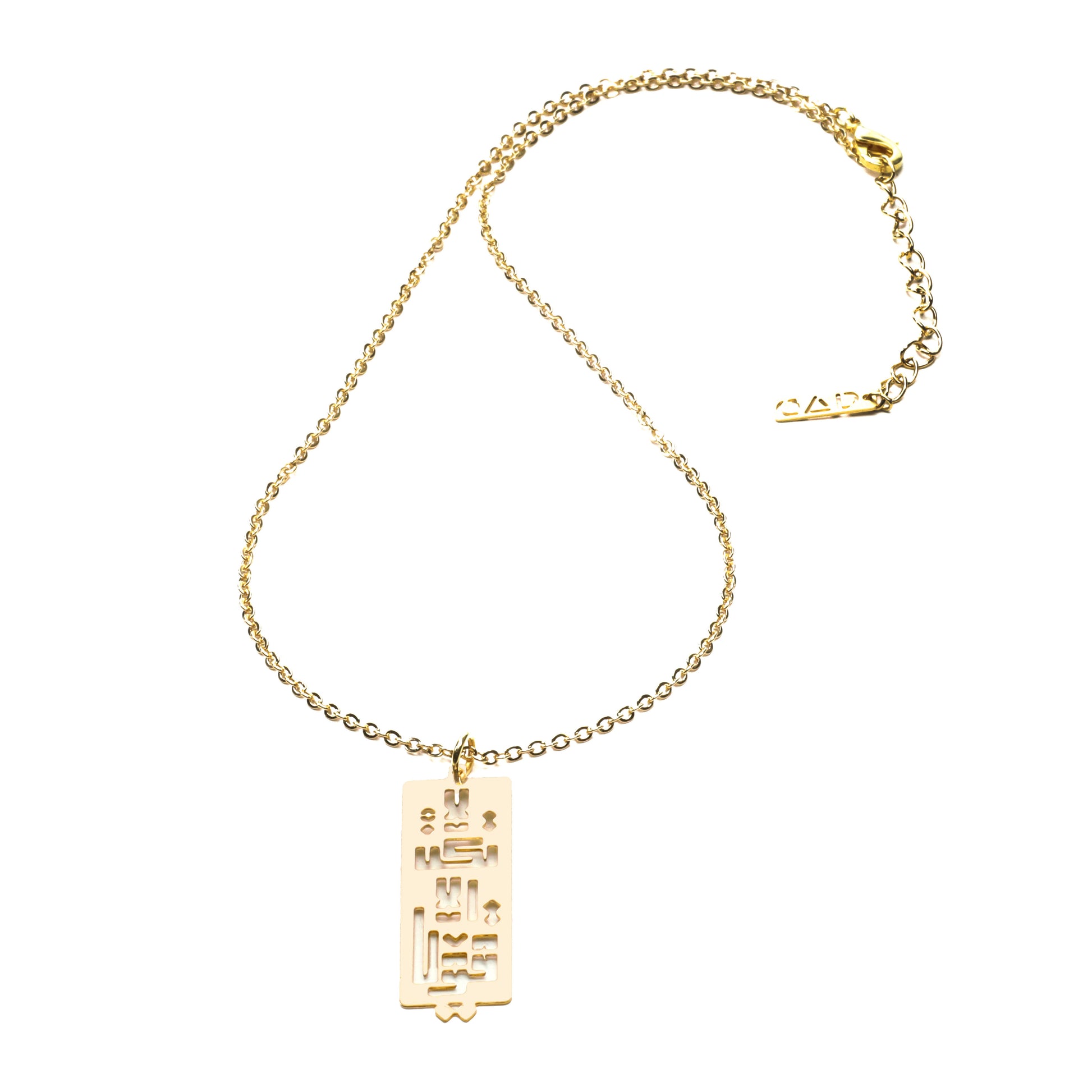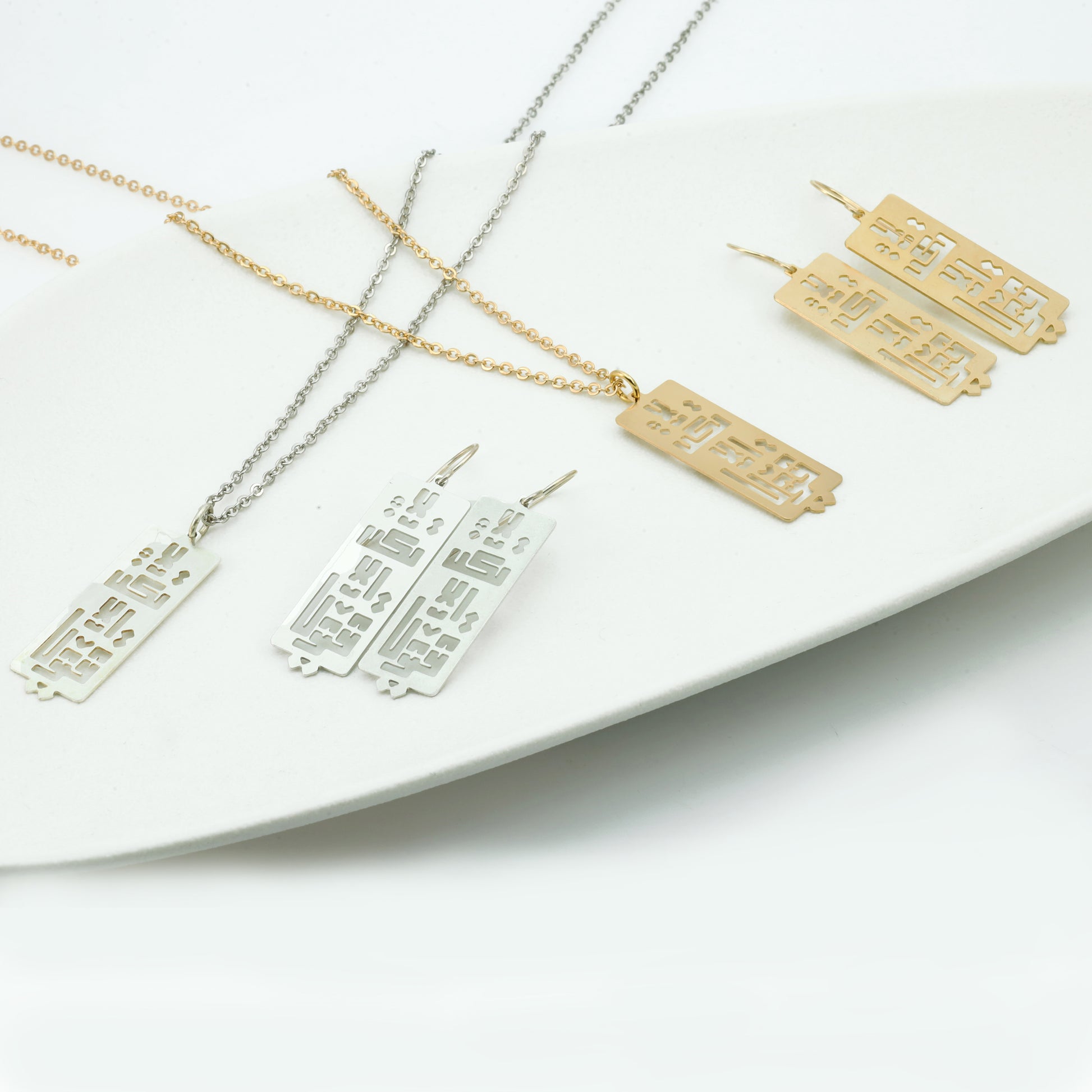 قلائد طويلة بتصميم ناعم وأنيق مزينة بالخط العربي الجميل، كل حجر كريم مطابق لكلمة مختلفة.