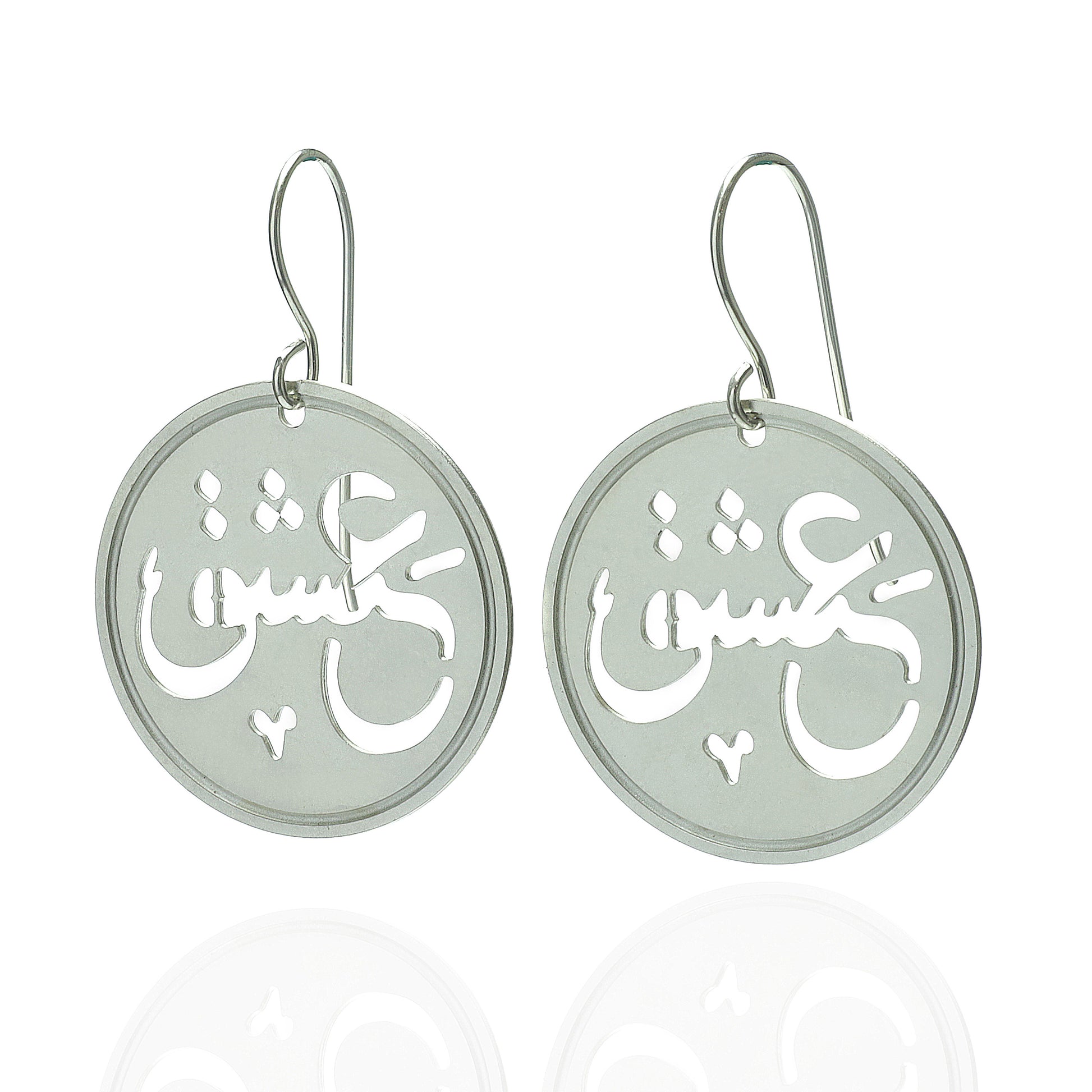 Classic round dangled earrings with Arabic Calligraphy plated silver .