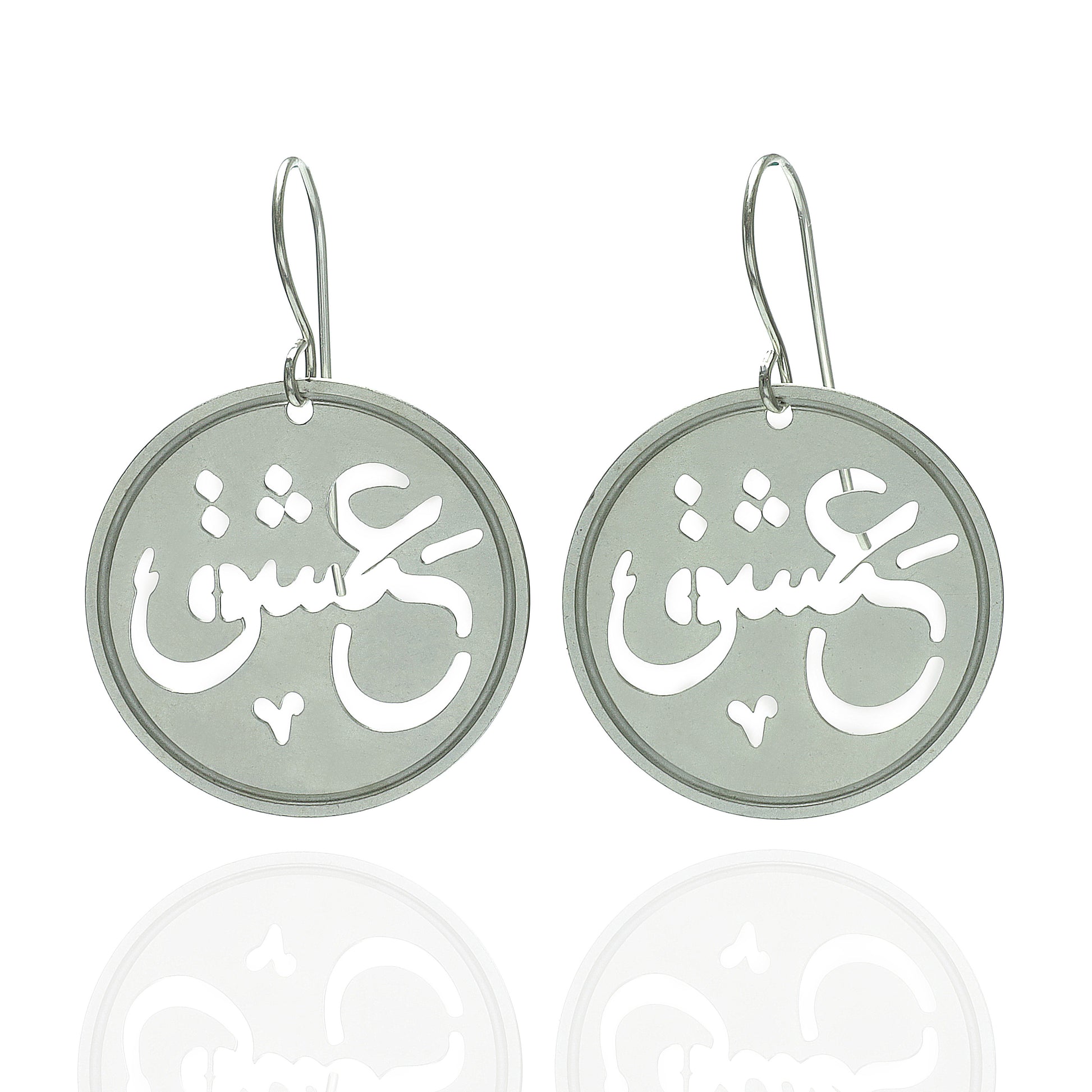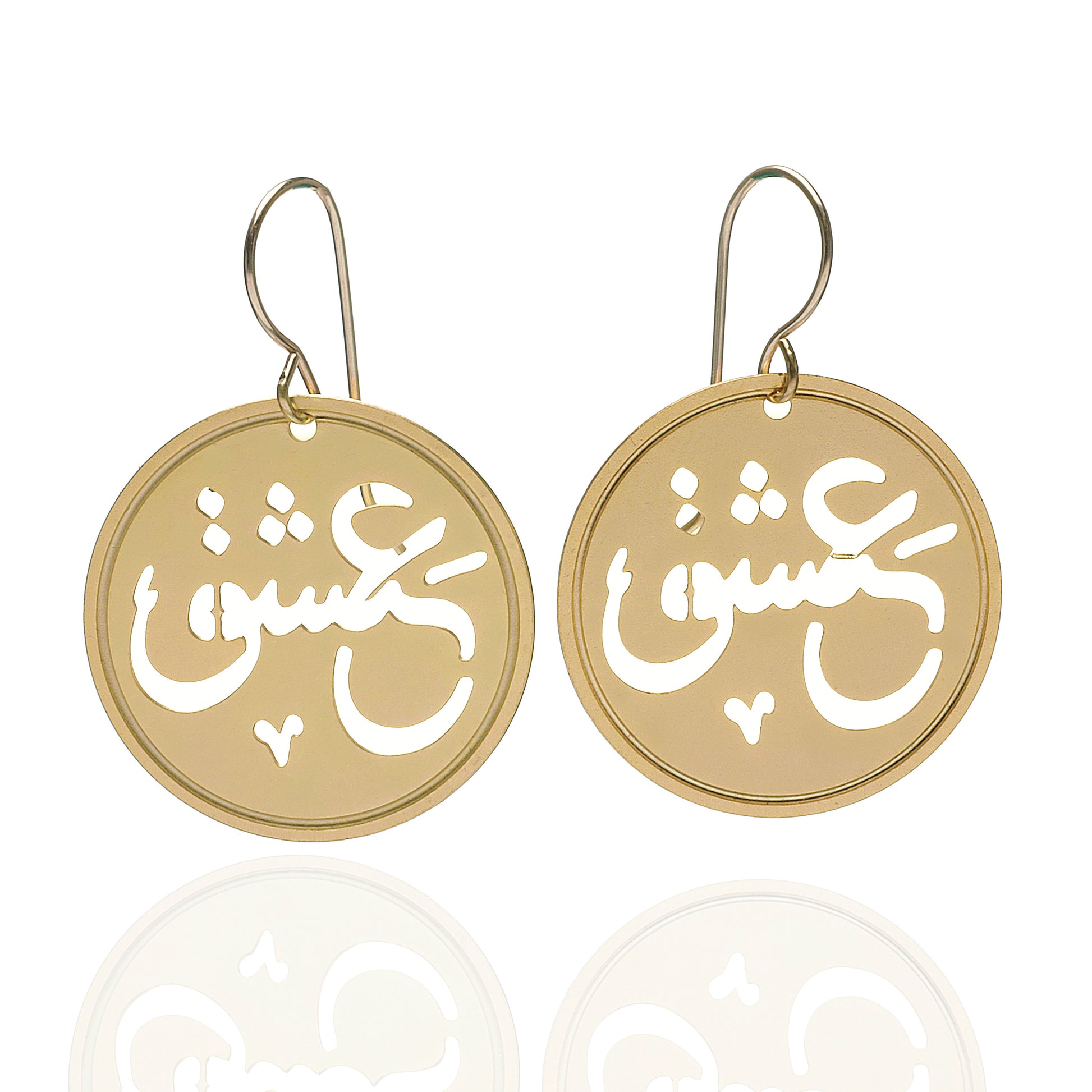 Classic round dangled earrings with Arabic Calligraphy plated gold .