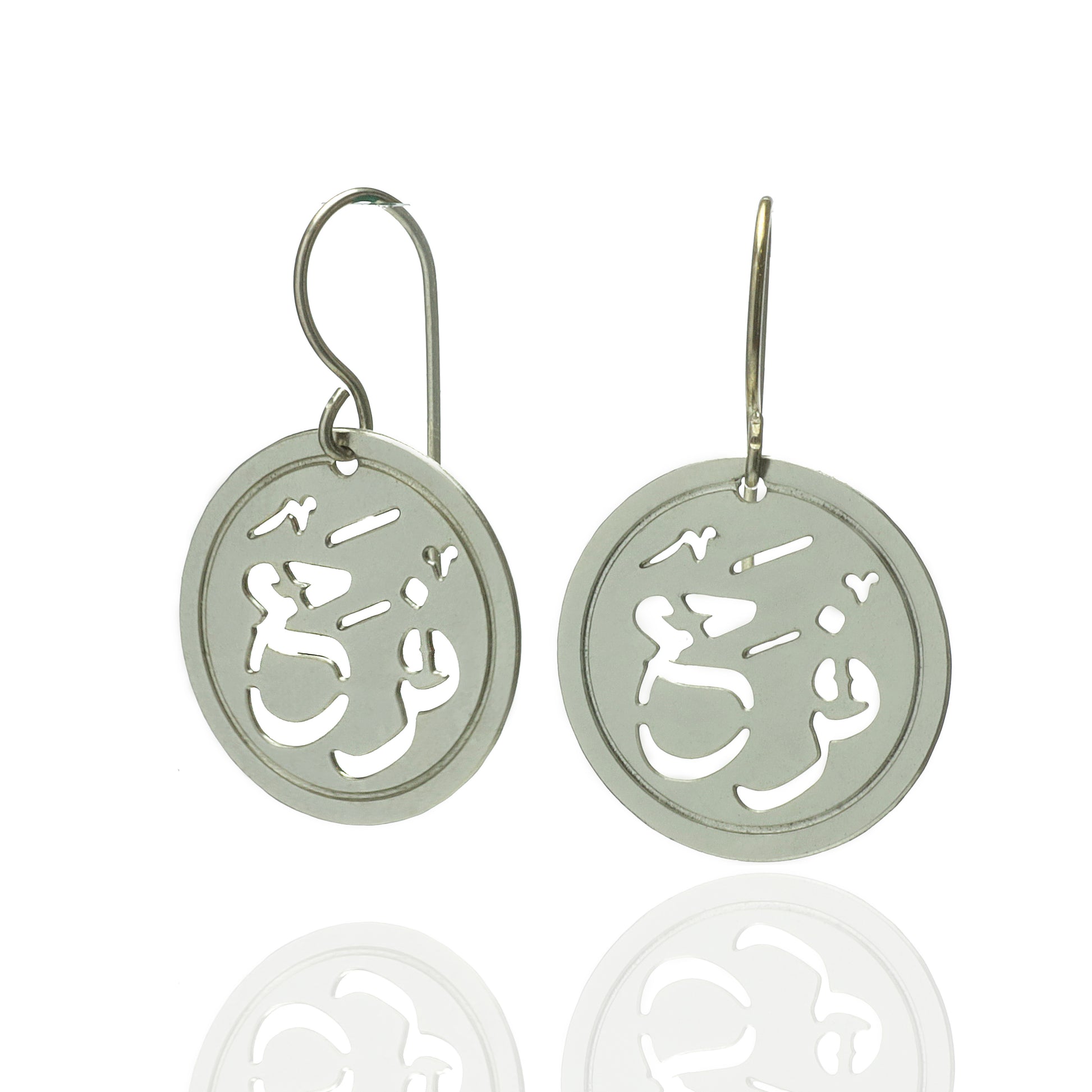 Classic round dangled earrings with Arabic Calligraphy "joy" plated silver .