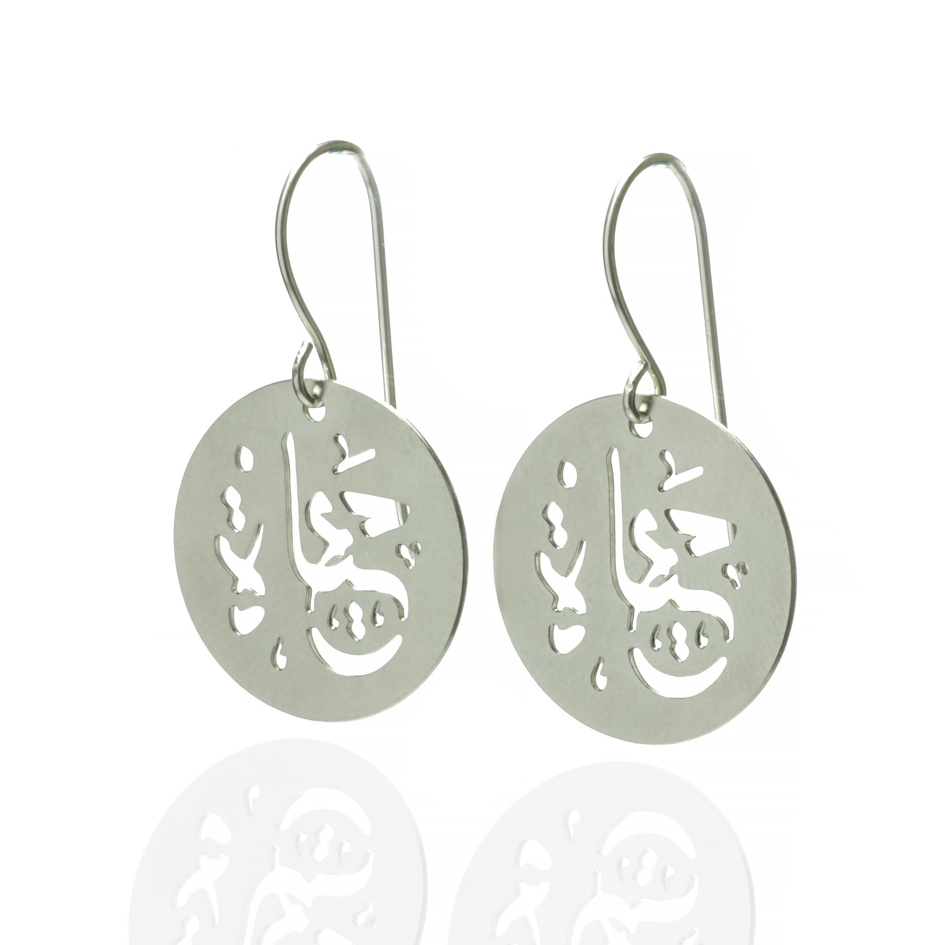 Classic round dangled earrings with Arabic Calligraphy "Life" plated silver .