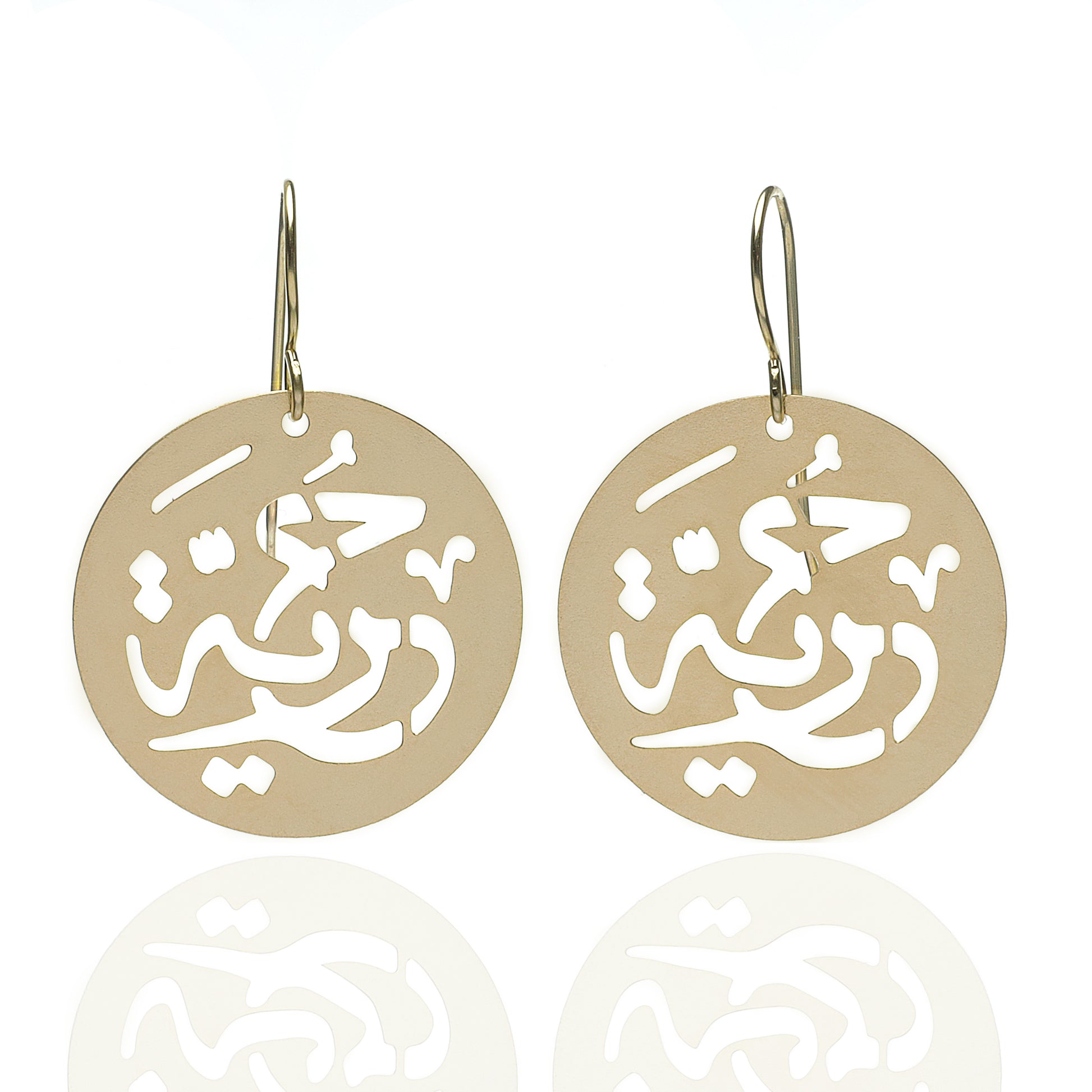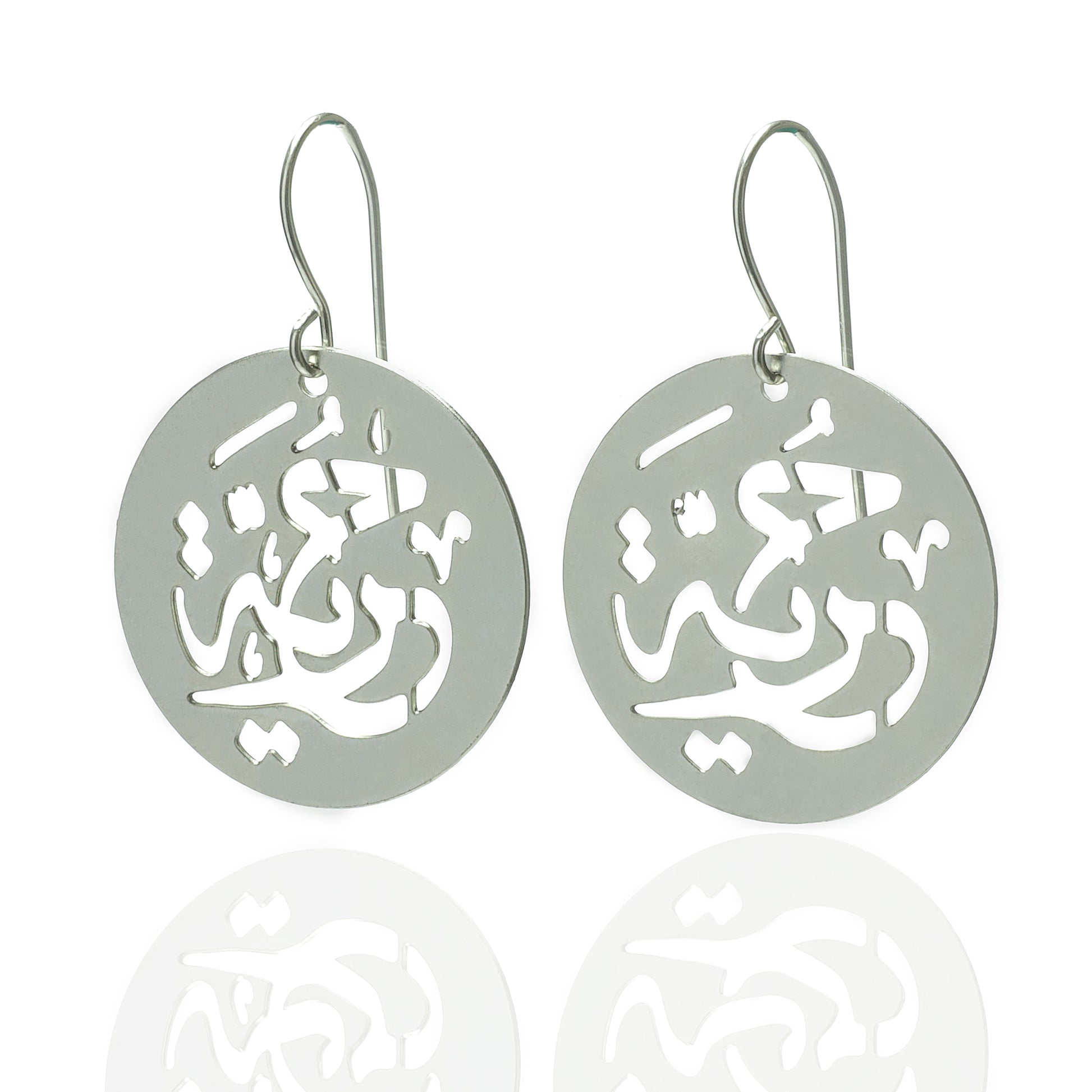 Classic round dangled earrings with Arabic Calligraphy plated silver .