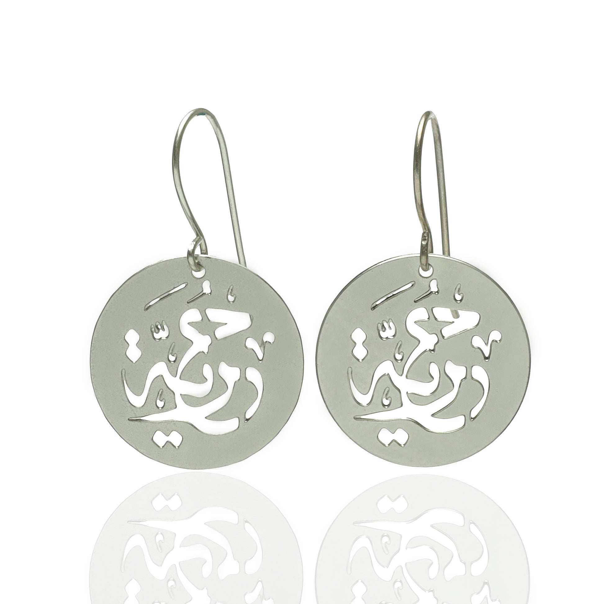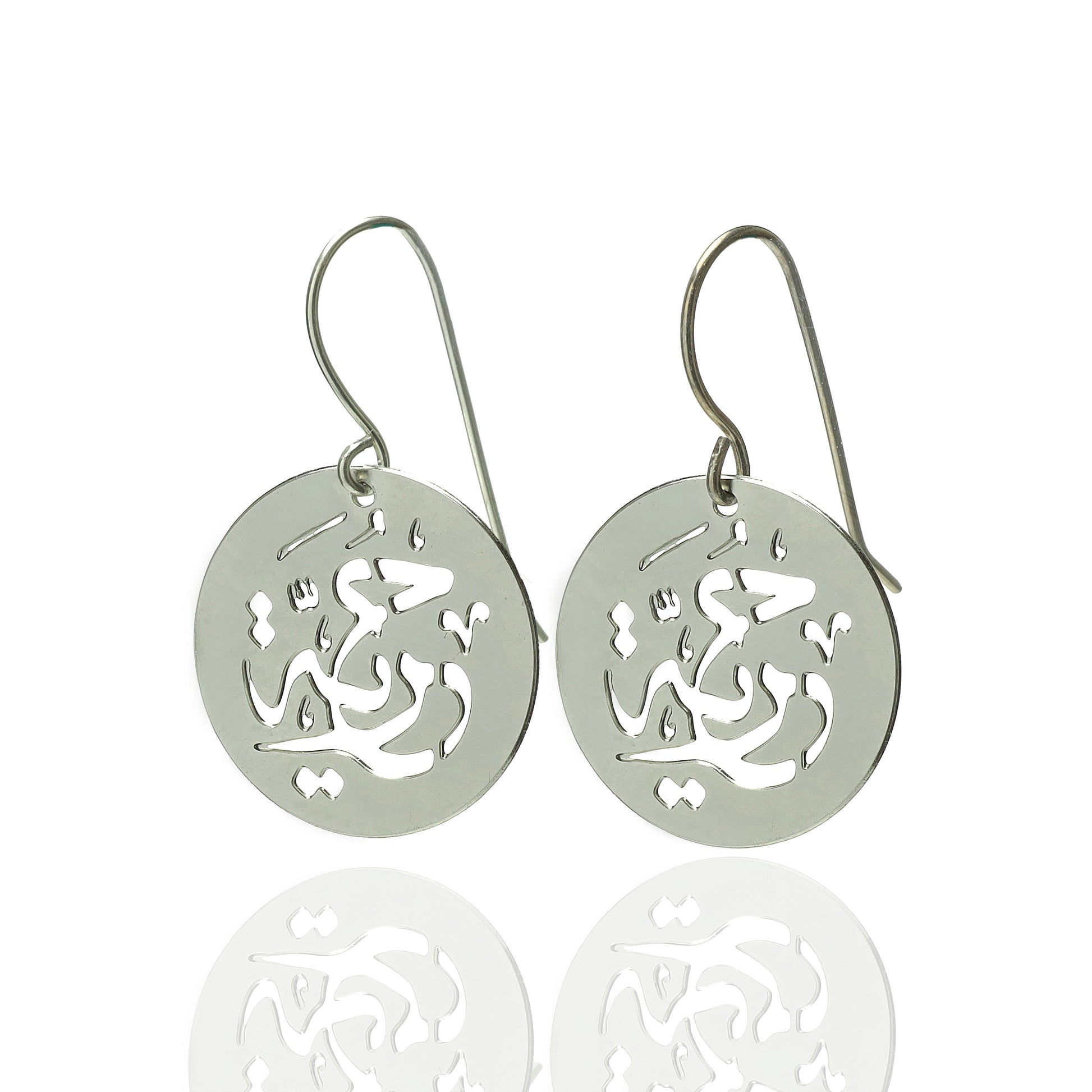 Classic round dangled earrings with Arabic Calligraphy "Freedom" plated silver .