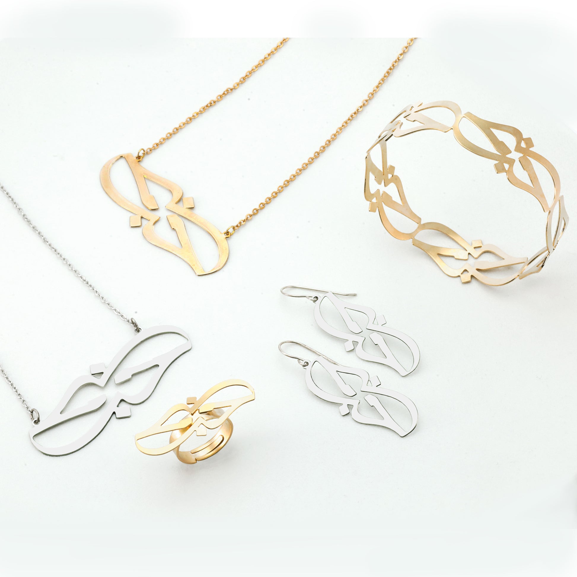 قلائد طويلة بتصميم ناعم وأنيق مزينة بالخط العربي الجميل، كل حجر كريم مطابق لكلمة مختلفة.