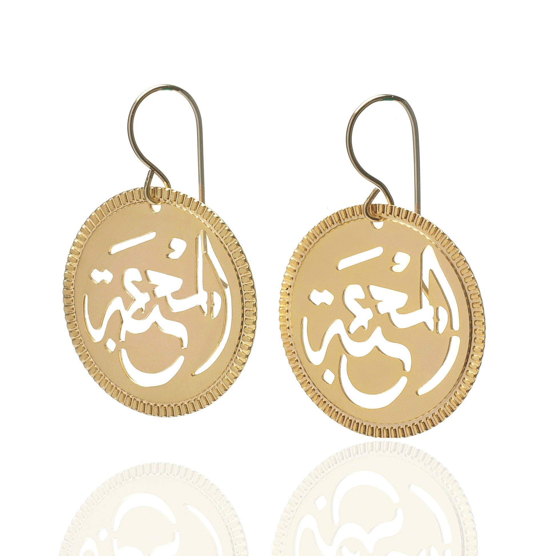 Classic round dangled earrings with Arabic Calligraphy "Love" plated gold .