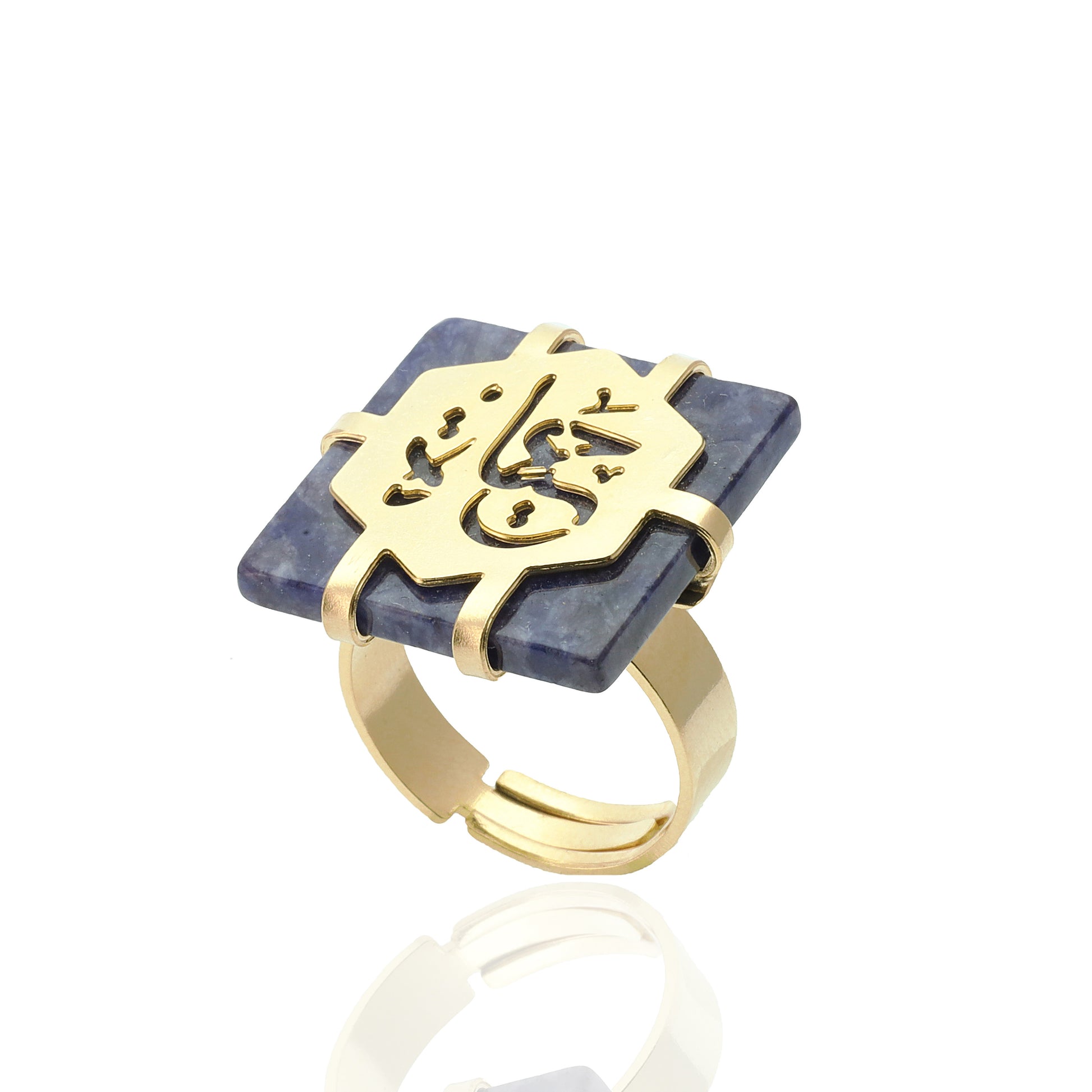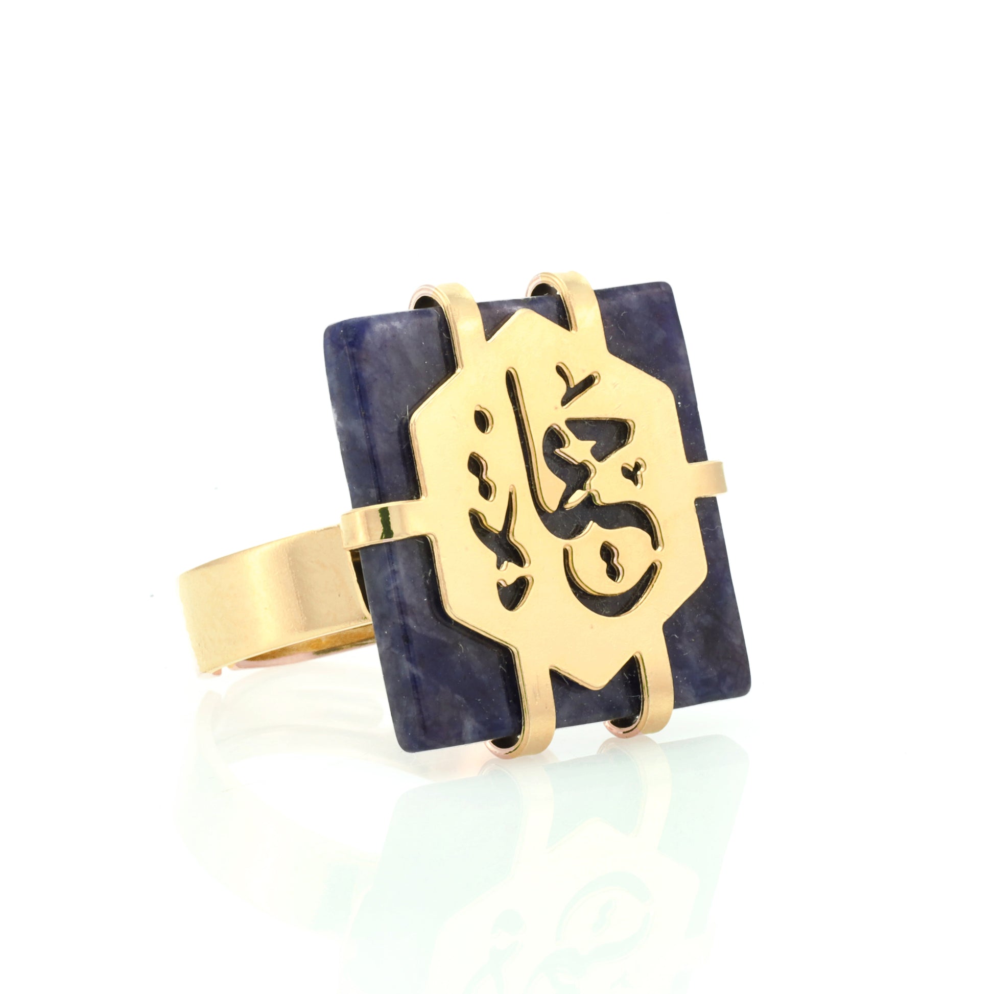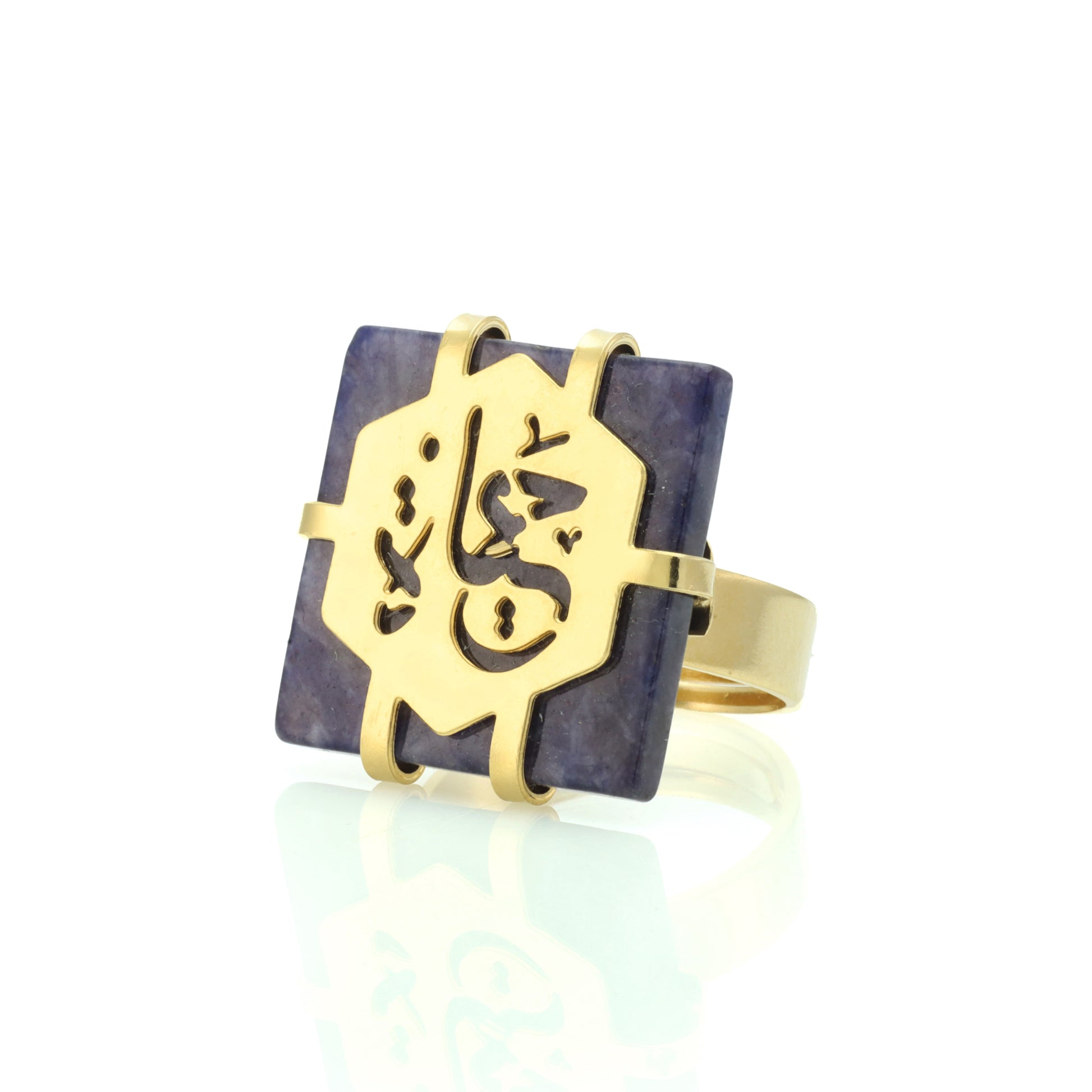 Square Ring is a cocktail ring made of a metal part with the Arabic calligraphy "Life" embedded around a square shape dark blue sodalite gemstone plated with a thick layer of gold.