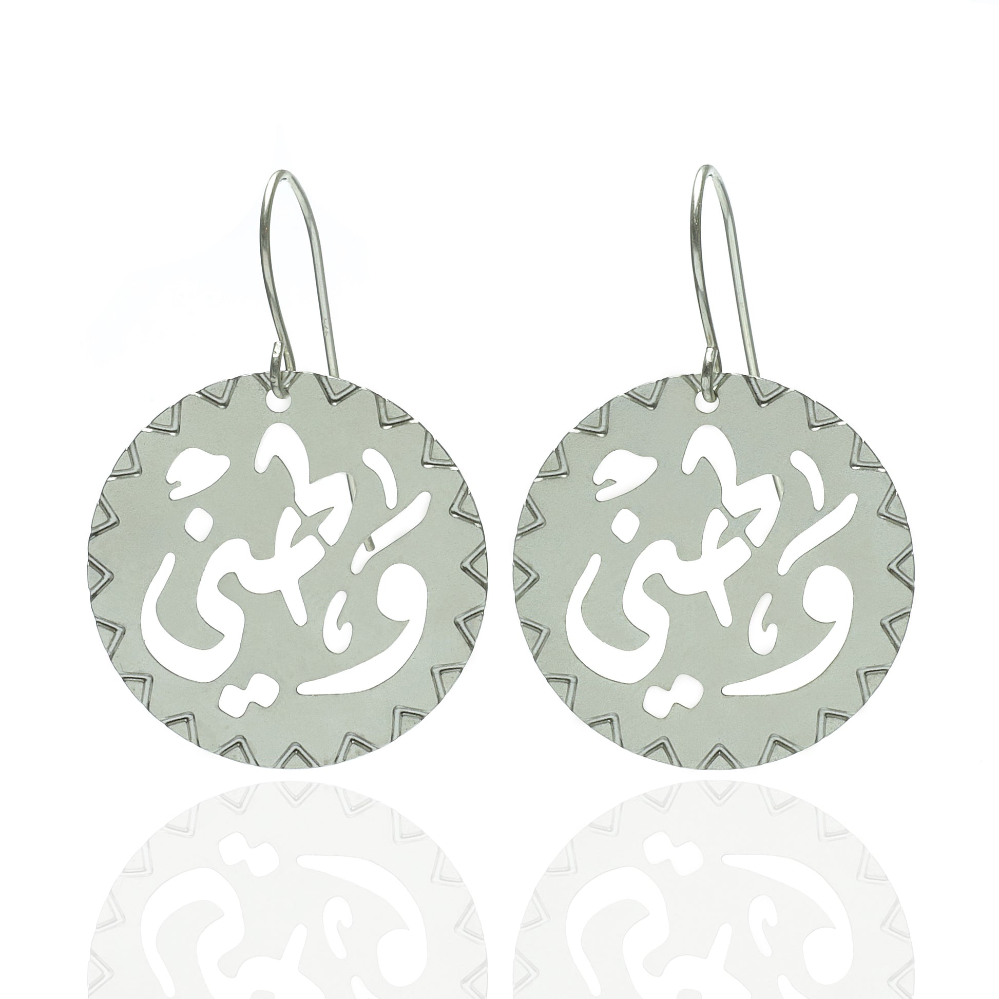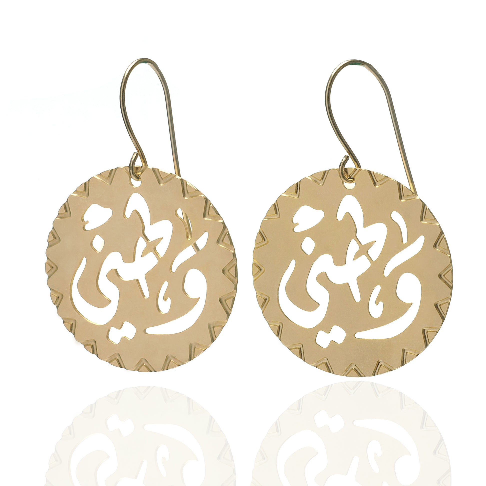 Classic round dangled earrings with Arabic Calligraphy plated gold .